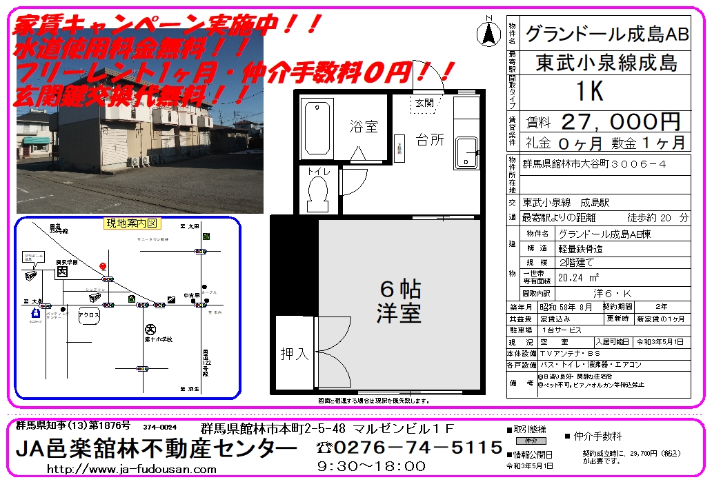 関東学園西側。6帖洋室・エアコン付!!