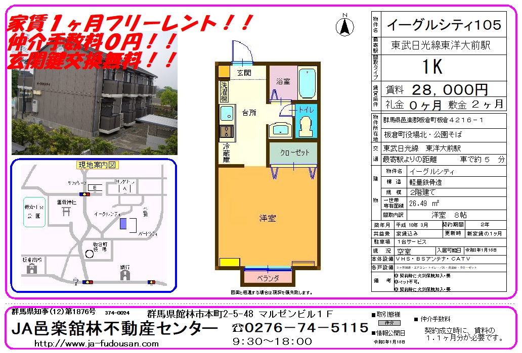 キャンペーン家賃実施中!!ガス器具付!!8帖洋室。
